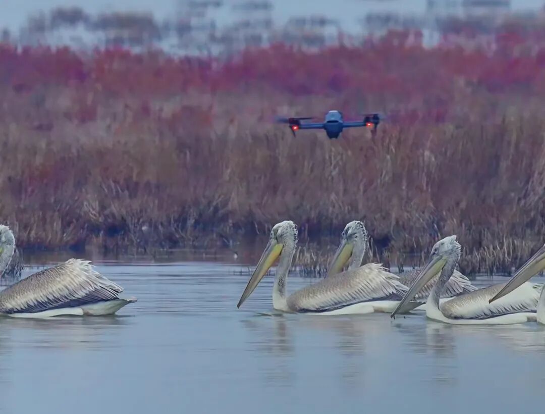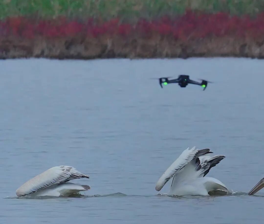 2025年9月,东营黄河口湿地,一架低飞的无人机正在靠近国家一级重点保护野生动物卷羽鹈鹕。图/受访者提供
